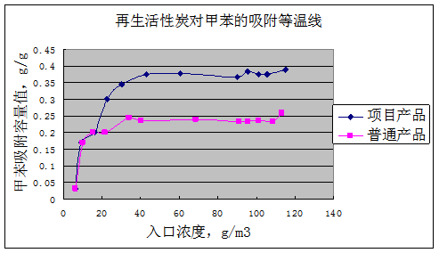 本產(chǎn)品主要是用特有工藝,促進(jìn)活化過程中所需孔隙的形成,使活性炭產(chǎn)品的孔徑分布均勻,提高產(chǎn)品對甲苯氣體的選擇性,使產(chǎn)品對甲苯吸附性能大幅度提高。通過對甲苯的吸附脫附試驗(yàn)以及客戶的實(shí)際使用情況得知,甲苯吸儲專用活性炭對甲苯吸附容量可達(dá)到450mg/g,再生吸附容量可達(dá)380mg/g。再生吸附率達(dá)到了84.4%。比普通活性炭有更佳的表現(xiàn),大大提高甲苯的回收率和使用壽命。