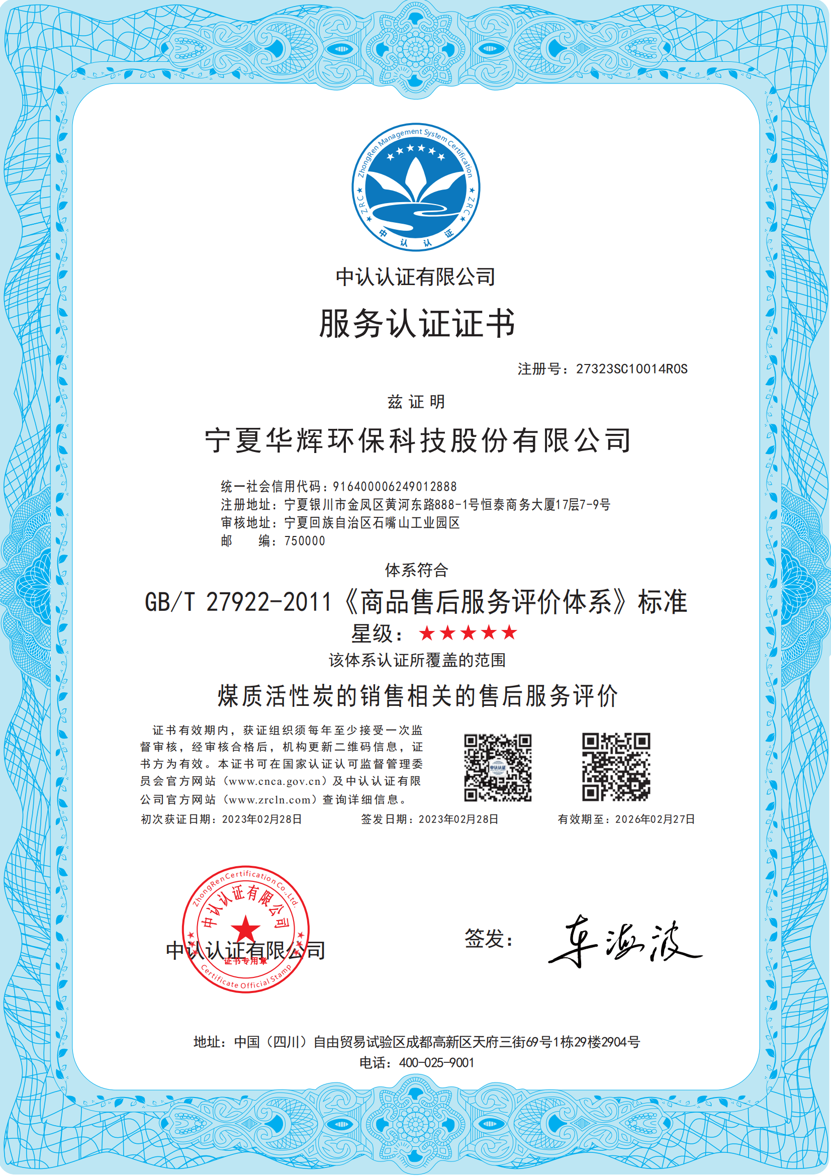 該服務體系認證是國家認監委批準的、由第三方機構展開的評價活動,認證機構頒發的證書是對我司企業服務產品質量和水平的科學評定,等級證書的權威信、公正性受國家法律保護。此證書是關于煤質活性炭的銷售相關的售后服務評價,它的意義在于讓顧客感知、關注我公司活性炭質量管理和服務特性滿足于廣大消費者對活性炭的新型認證制度,是對服務提供者的管理及服務水平是否達到相關標準要求的合格評定活動,是對華輝面向客戶的售后服務體系工作的肯定。